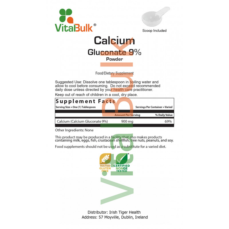 | Calcium (Calcium Gluconate 9%) | 900 mg | 69% |