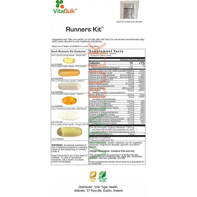 Runners Kit – Active Ingredients: Vitamin A (fish liver oil) 3000 mcg RAE (10,000 IU), Vitamin C (ascorbic acid) 1,000 mg, Vitamin D-3 (cholecalciferol fish liver oil) 10 mcg (400 IU), Vitamin E (d-alpha tocopherol from soy) 267 mg (400 IU), Vitamin B1 (thiamine mononitrate, HCl) 50 mg, Vitamin B2 (riboflavin) 50 mg, Niacin (niacinamide) 50 mg NE, Vitamin B6 (pyridoxine HCl), Folic Acid (folate) 400 mcg DFE, Vitamin B12 (methylcobalamin, cyanocobalamin) 50 mcg, Biotin (d-biotin) 50 mcg, Pantothenic Acid (d-calcium pantothenate) 50 mg, Calcium (calcium carbonate) 250 mg, Iron (ferrous fumarate) 9 mg, Iodine (potassium iodide) 112 mcg, Magnesum (magnesium malate) 125 mg, Zinc (zinc citrate) 7.5 mg, Selenium (l-selenomethonine) 35 mcg, Copper (copper gluconate) 1 mg, Manganese (manganese citrate) 2 mg, Chromium (chromium polynicotinate) 60 mcg, Molybdenum (sodium molybdate) 37 mcg, Potassium (potassium carbonate, iodide) 23 mg, Fish Oil (anchovies, sardines, mackerel) 1,200 mg, Cobalt (cyanocobalamin) 1 mcg.
