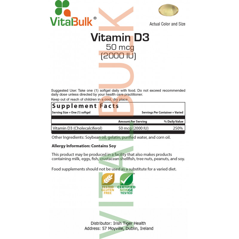 | Vitamin D3 (Cholecalciferol) | 50 mcg (2000 IU) | 250% |