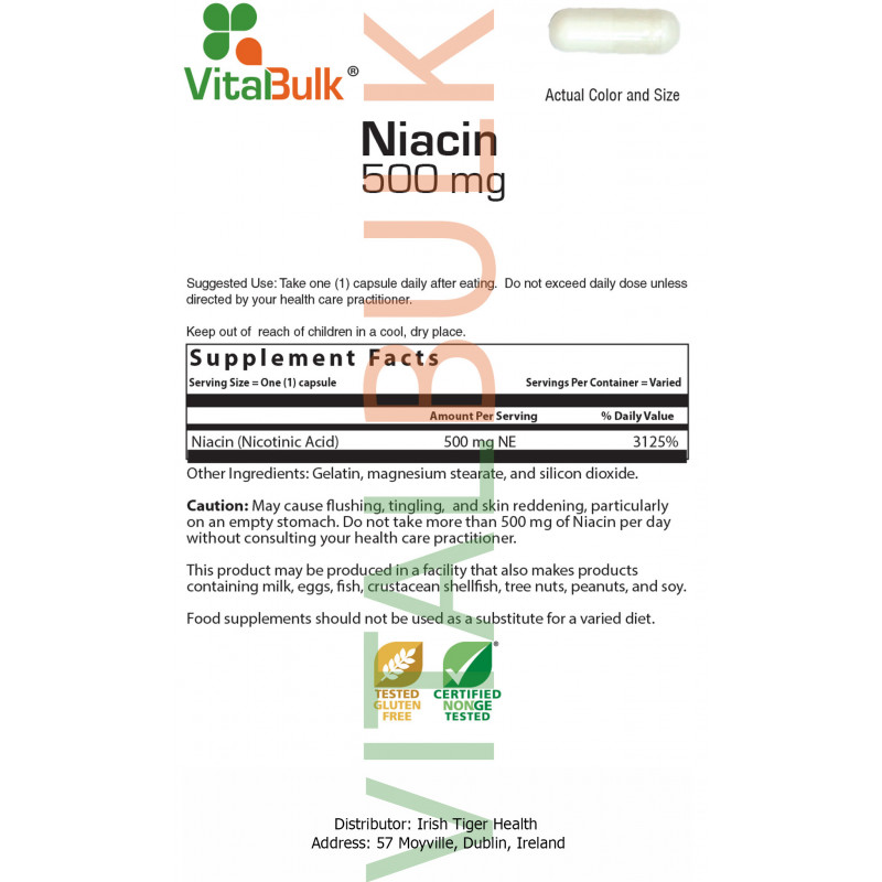 Внимание: Может вызвать гиперемию, покалывание, и покраснение кожи, особенно на пустой желудок. Не принимайте более 500 мг ниацина в день без консультации врача.