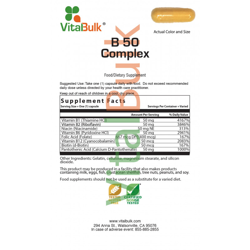 Активные ингредиенты: Витамин В1 (в виде тиамина гидрохлорида) 50 мг. Витамин В-2 (в виде рибофлавина) - 50 мг, ниацинамид - 50 мг, витамин В-6 (в виде пиридоксина HCI) - 50 мг, витамин В-12 (в виде цианокобаламина) - 50 мкг, фолиевая кислота (в виде фолата) - 400 мкг, биотин (в виде d-биотина) - 50 мкг., Пантотеновая кислота (в виде D-пантотената кальция) 50 мг.
